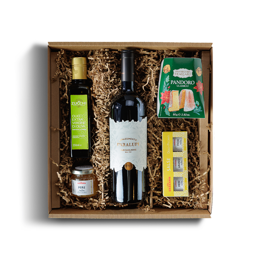 Starannie skomponowany zestaw prezentowy łączący wyraziste czerwone wino z włoskimi delikatesami i słodkim akcentem. Idealny jako elegancki upominek na wyjątkowe okazje, świąteczne spotkania oraz dla miłośników bogatych smaków.